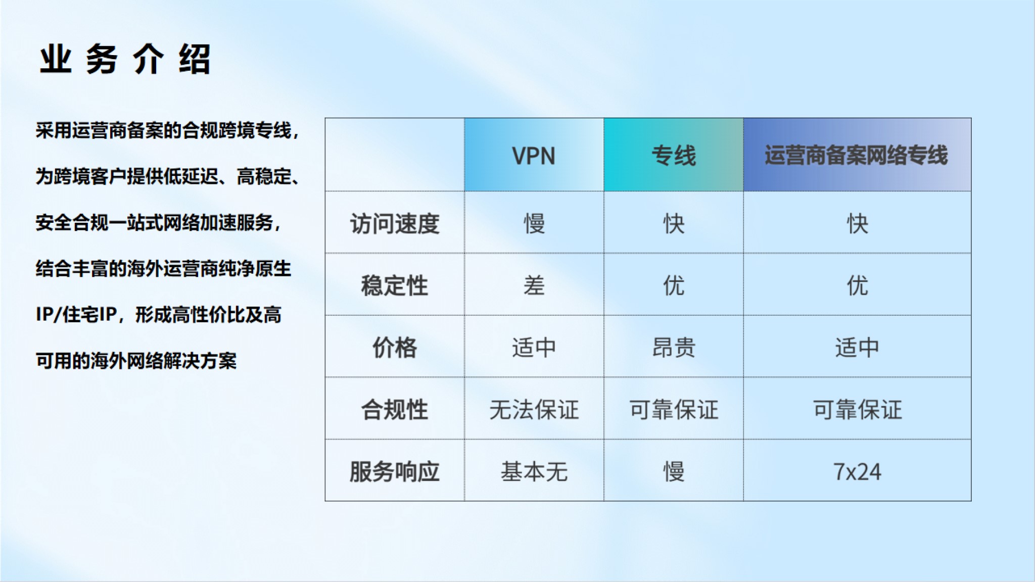 遵從運營商規(guī)則,采用運營商備案網(wǎng)絡專線,結(jié)合海外運營商純凈獨享原生IP,提供低延遲、高穩(wěn)定、安全合規(guī)的海外網(wǎng)絡服務